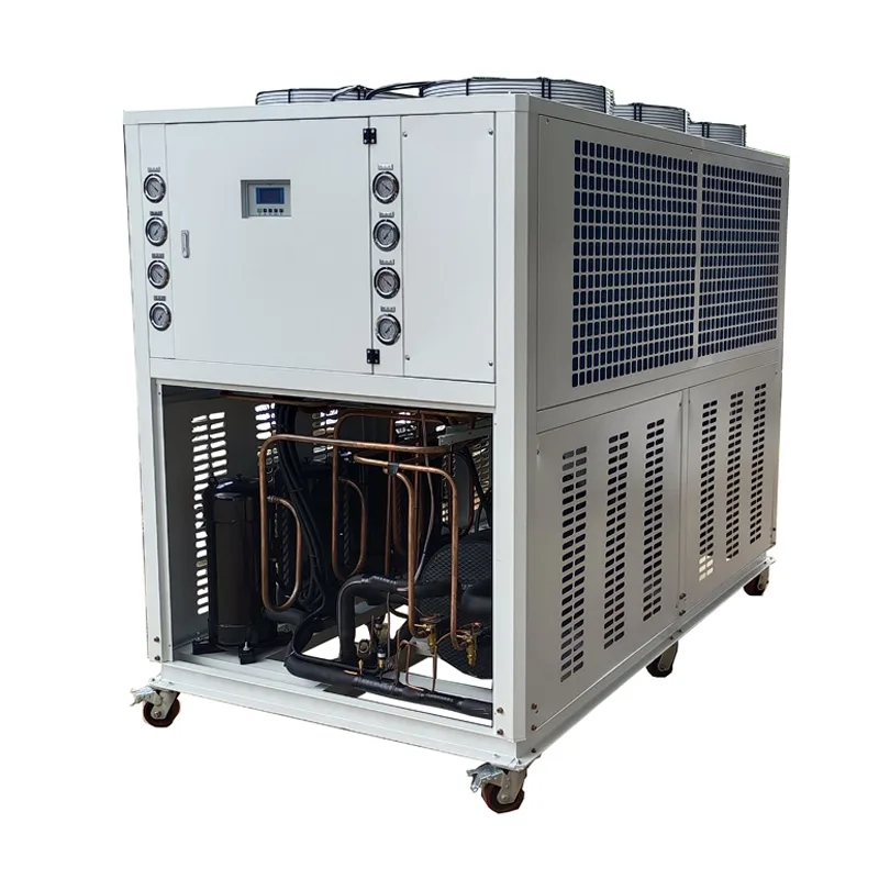 Unlike water cooled packaged scroll chillers, an air cooled packaged chiller typically does not require water cooling tower for operation,you just use pipes to connect with your machine for use. This results in a simpler structure and easier installation for you, allowing it to be rapidly deployed.