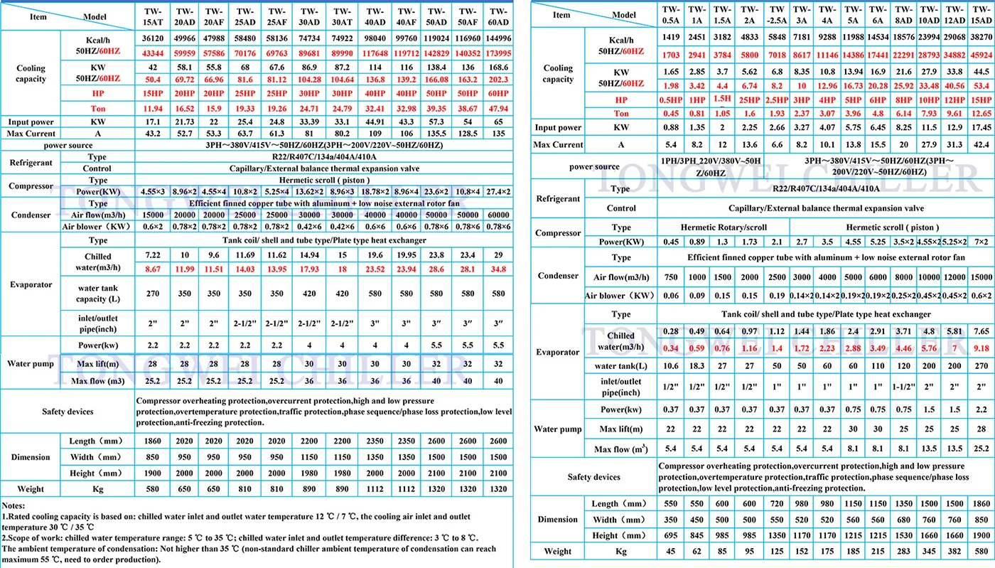 One of the most frequently ask about how we can know the cooling capacity for chillers. We use KW ,Ton, But/h,Kcal/h to choose chiller cooling capacity :1 KW=860 kcal/h ; 1 TON=3.517 KW;